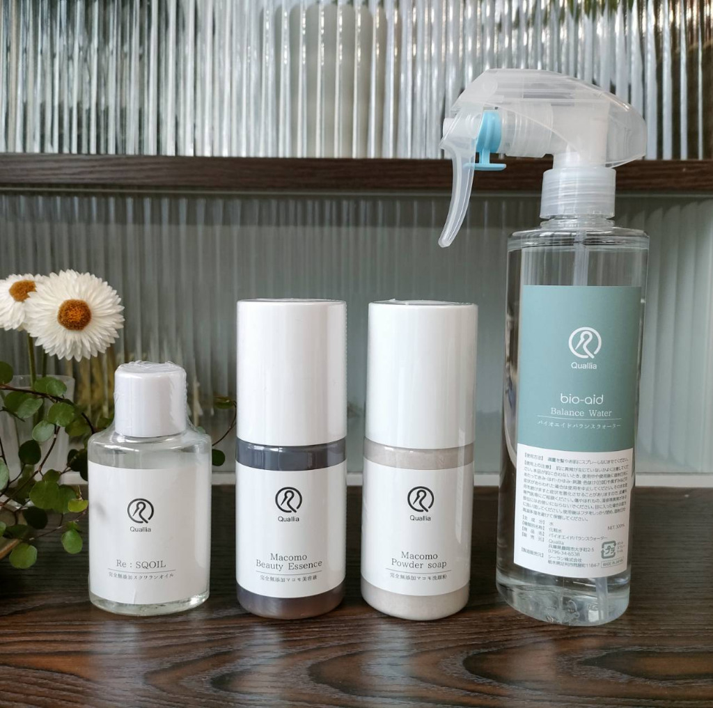 例を挙げると、洗顔料には、お肌の菌活もできる「マコモ洗顔パウダー」がおすすめ。二度洗いすれば、クレンジングも必要ありません。発酵マコモとマグマ塩の洗顔パウダーが、汚れを優しく落とし、使うほどに透明感のある ふっくらみずみずしいお肌に導きます。化粧水には、マイナスイオンと酸素・81種類の野草酵素水で作られたダメージ回復水である「バランスウォーター」がおすすめ。優れた浸透力が特徴で、お肌をはじめ、頭皮や毛根に働きかけます。乾燥した肌には、発酵マコモとマグマ塩の美容液・生きた完全無添加化粧品の「マコモ美容液」、保湿には「Re:SQOILスクワランオイル」がおすすめ。最高品質アイザメのスクワラン100%をいつものケアにプラスして潤いをキープ、などなど。